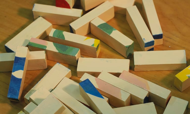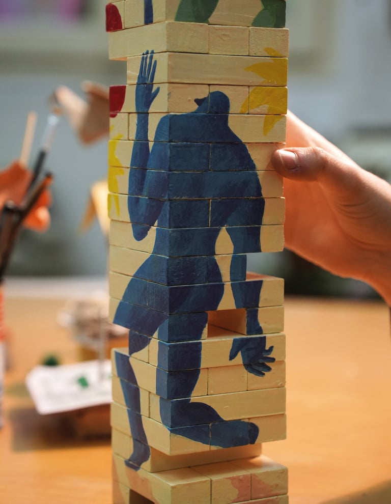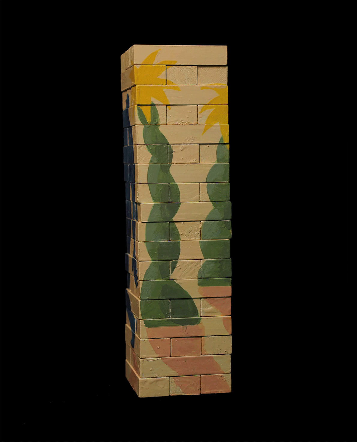 “Jenga” is not only a board game but also a sculpture painted with enamels and acrylics.